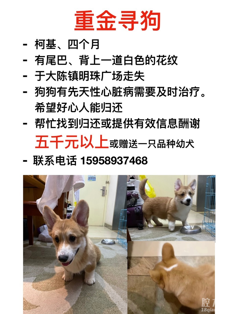 如图,希望好心人帮忙留意。柯基腿很短,留尾巴的不多。看到请帮忙留意联系我,重金酬谢。