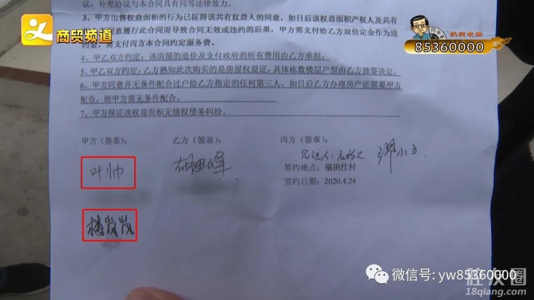 最近,在义乌经商的宁波人胡迪峰找到我们栏目,说去年买了福田街道云溪村村民叶帅在湖塘区块的权益面积,后来发现,叶帅把家里的权益面积通过四家中介卖给了七位买家,但是他根本提供不了这么多平方。