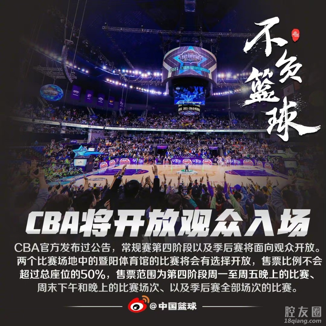 CBA官方发布公告,正式通知剩余常规赛和季后赛将会对观众开放!两个比赛场地中的暨阳体育馆(总计4000个座位)将会有选择的售票开放,分三个阶段逐步放开进场人数,而根据防疫规定,最终的入场人数也不会超过50%的上座率。#CBA将开放观众入场##CBA联赛允许观众入场#