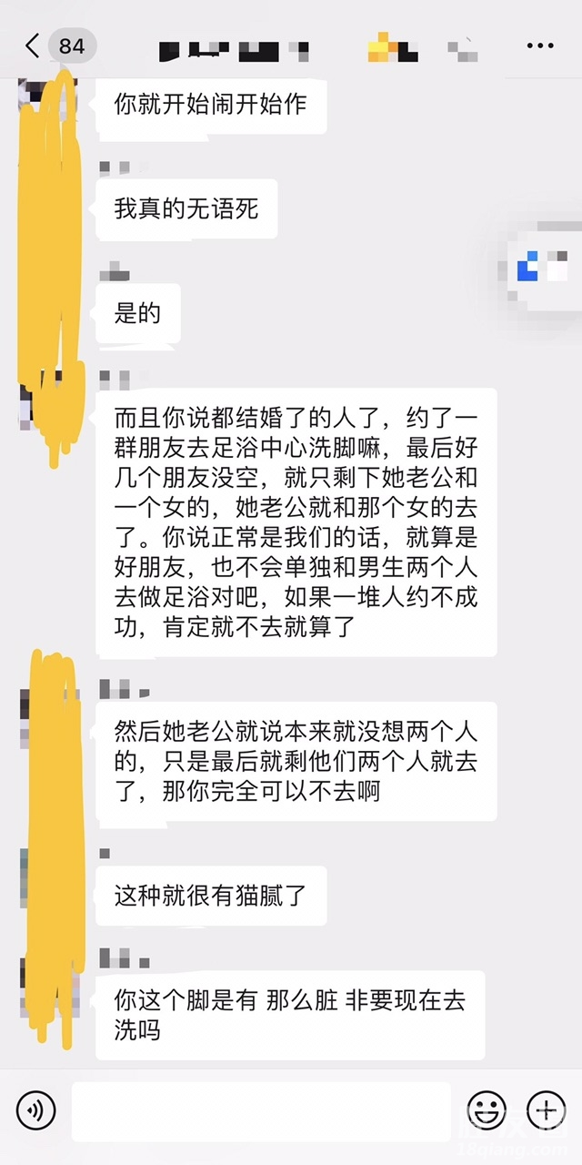 群里朋友在说,她朋友老公和别的女的去洗脚被发现了,