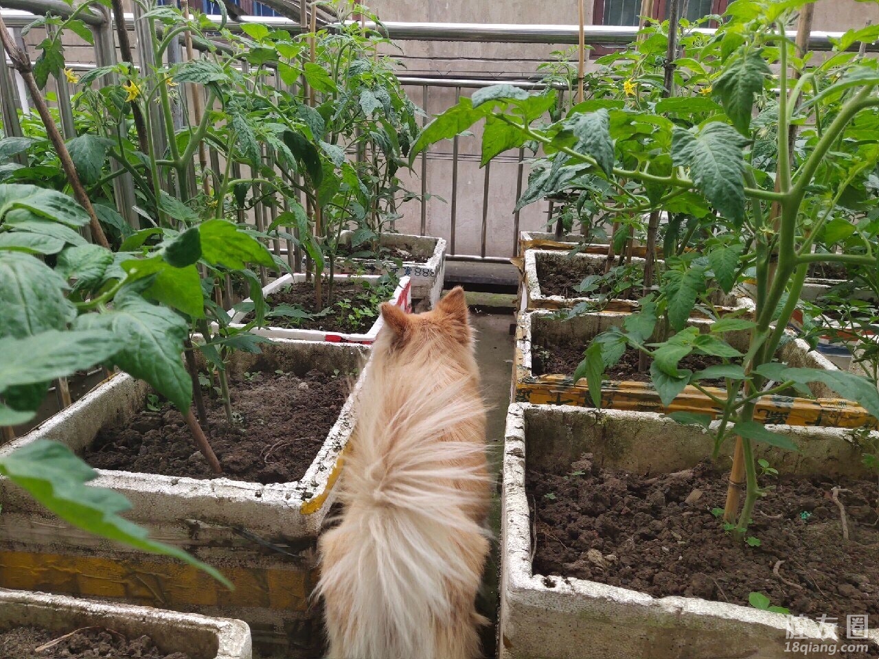 阳台菜园,种了19株番茄10株青瓜,再过一个月可以有收获了。狗狗陪伴我们13年了。
