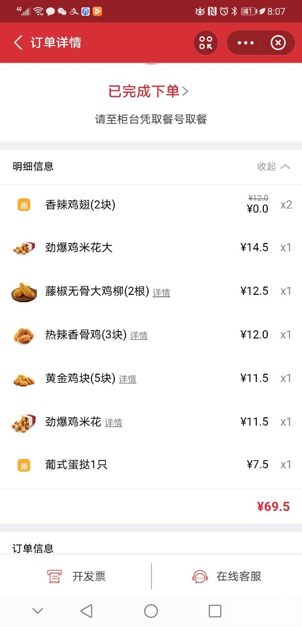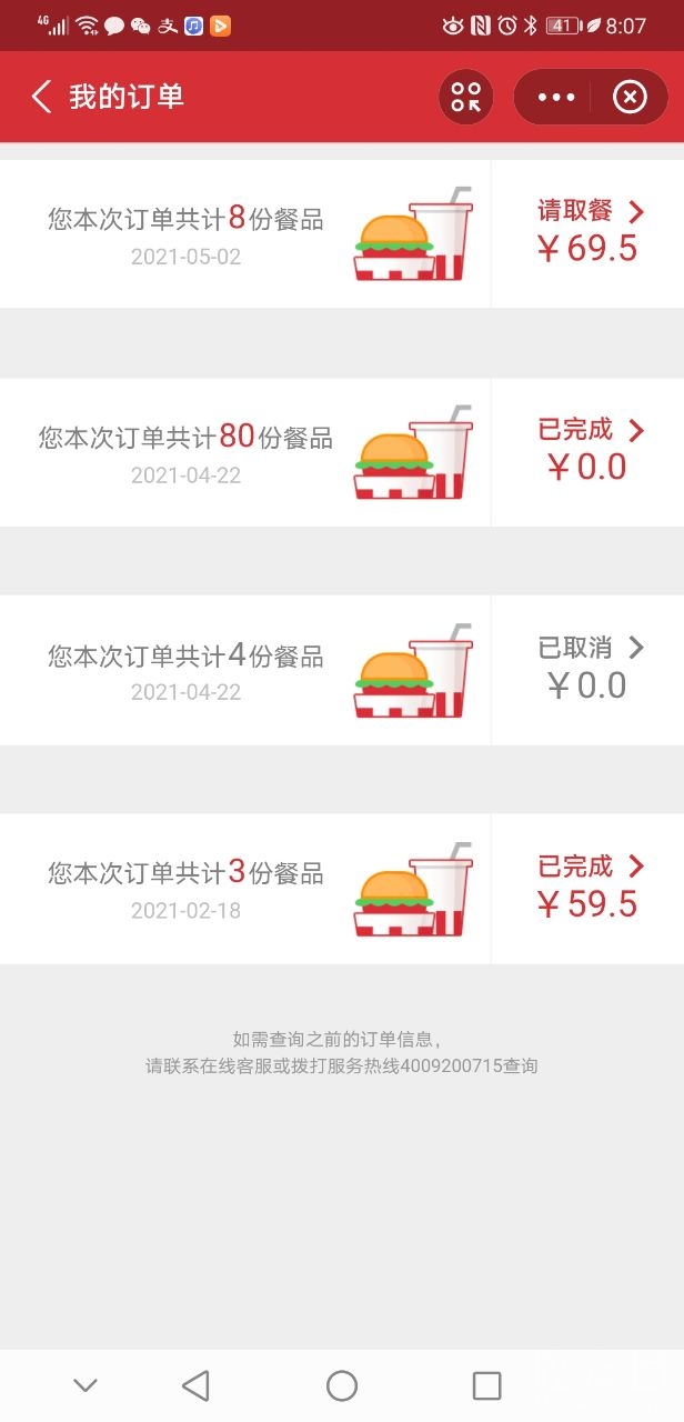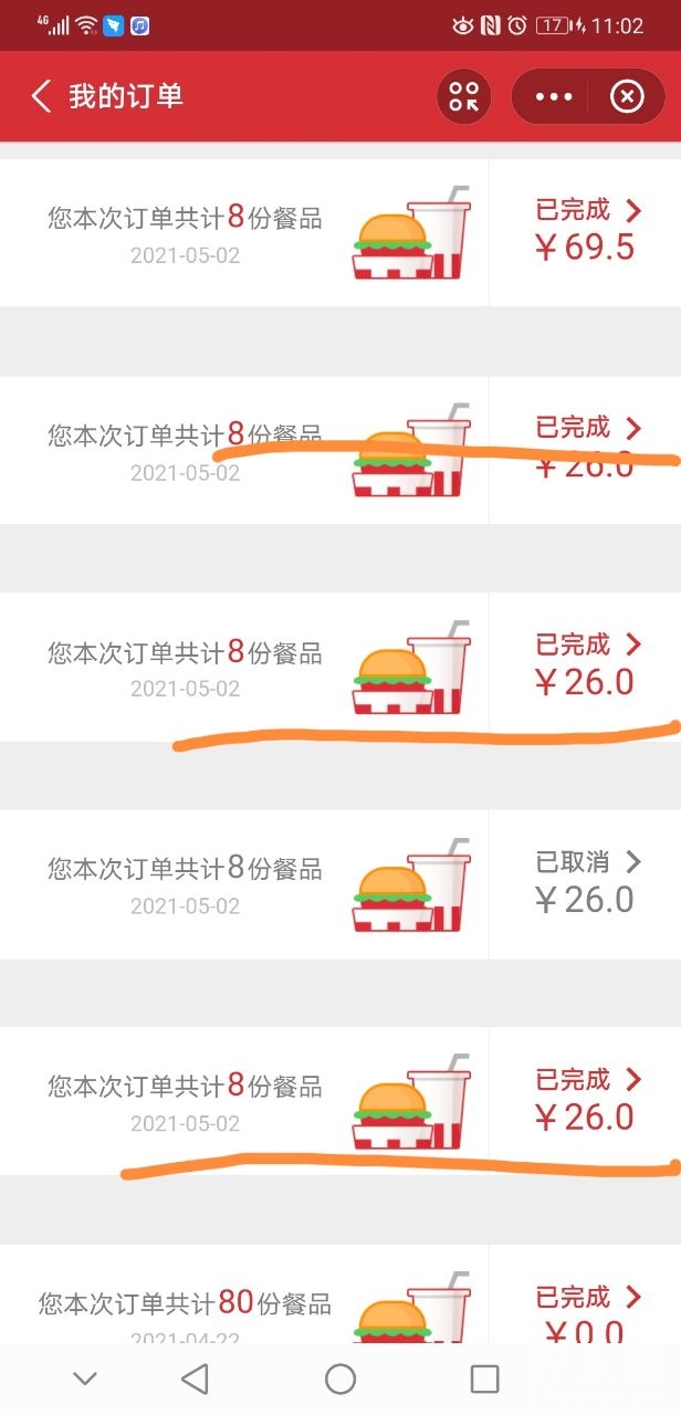 那天在肯德基买了100份鸡翅加翅根,买的当天就消费了80份,昨天在手机上操作一直就是系统繁忙,后面去的肯德基店里定好了单,回来就发现卡包里面只有个位数的两份还是六分忘记了,反正数量不对,今天更加奇葩,多出来三个订单成功的,狗bei的!如果昨天订单跳出来了,对吧,我最起码要把肯德基拿回来,最奇葩的是26元钱没有付出去过,订单怎么会成功的,奇了怪了。这个怎么弄有没有朋友知道的