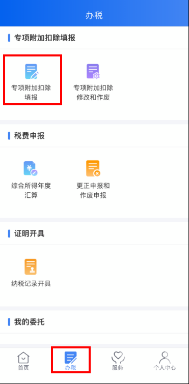 第一步 进入申报界面 纳税人登录手机个人所得税APP后,可通过“首页——常用业务——专项附加扣除填报”或“办税——专项附加扣除填报”进入专项附加扣除填报界面,并选择“婴幼儿照护费用”专项附加扣除。