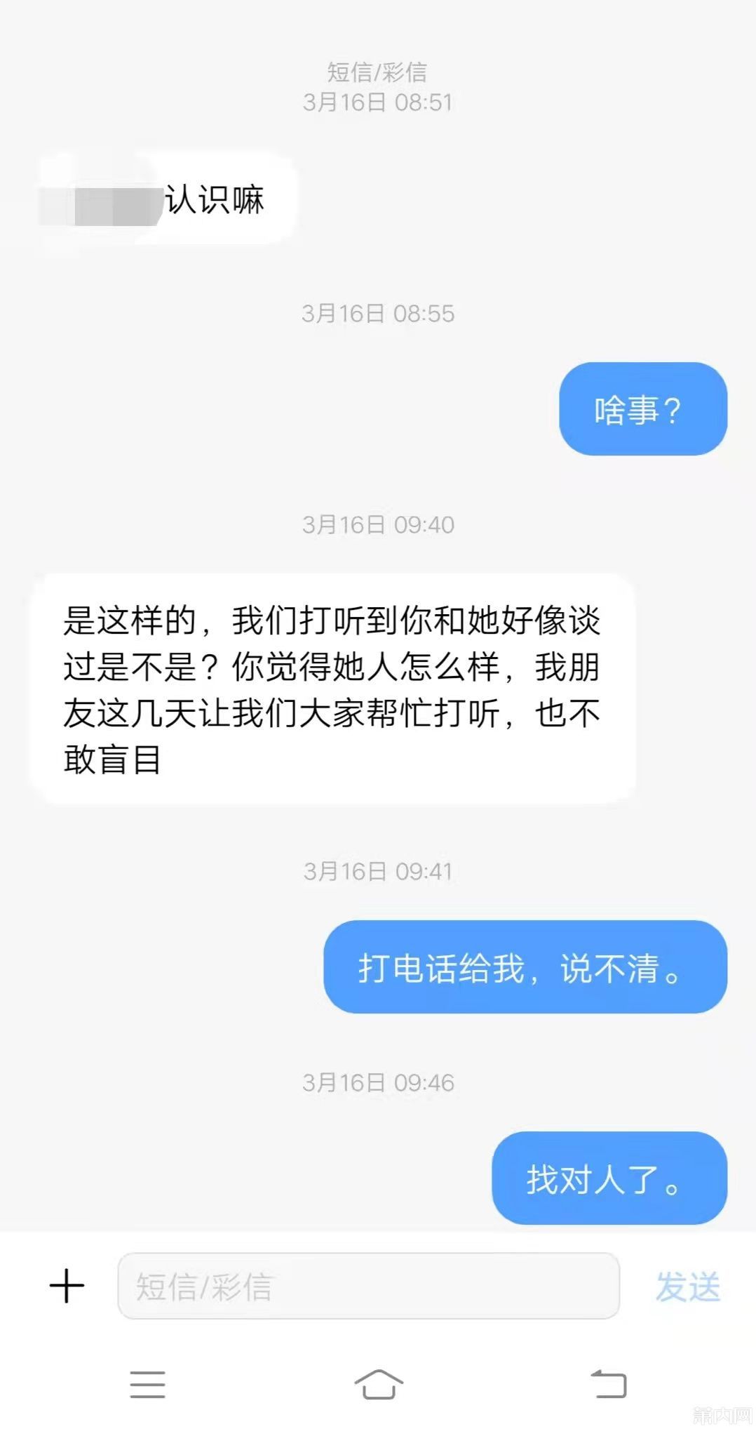 3月17号收到一个短信,我有点莫名其妙,我还以为是谁?看到短信之后,我有点懵逼,虽然我很相信我女朋友,但是我还是很意外,忍不住我立马去问我女朋友了, 我女朋友说有人格担保,绝对不是真的,我很好奇,到底是谁发的这种无聊的短信?最后我去查了这个号码,这个号码居然是我女朋友闺密的男朋友的爸爸名下的, 我女朋友不敢相信会是她闺密发的。闺密是幼师,平时看起来很忠厚。简直是难以相信。因为这种挖墙脚的事,一般都是上了年纪的人才会这么干,但我没想到她闺蜜居然会这么做。