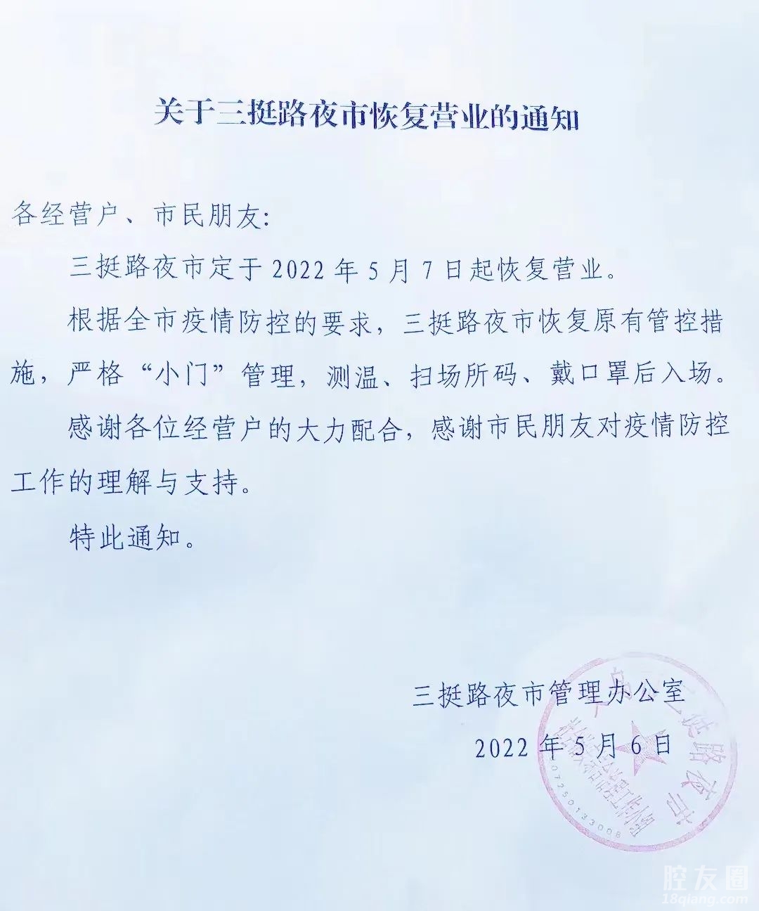 关于三挺路夜市恢复营业的通知