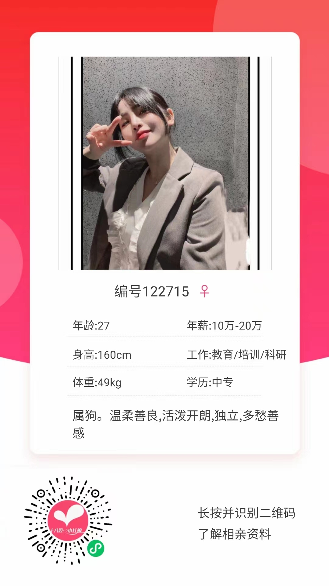 性格温柔善良,活泼开朗,独立,多愁善感 。 喜欢旅游,体育,跳舞