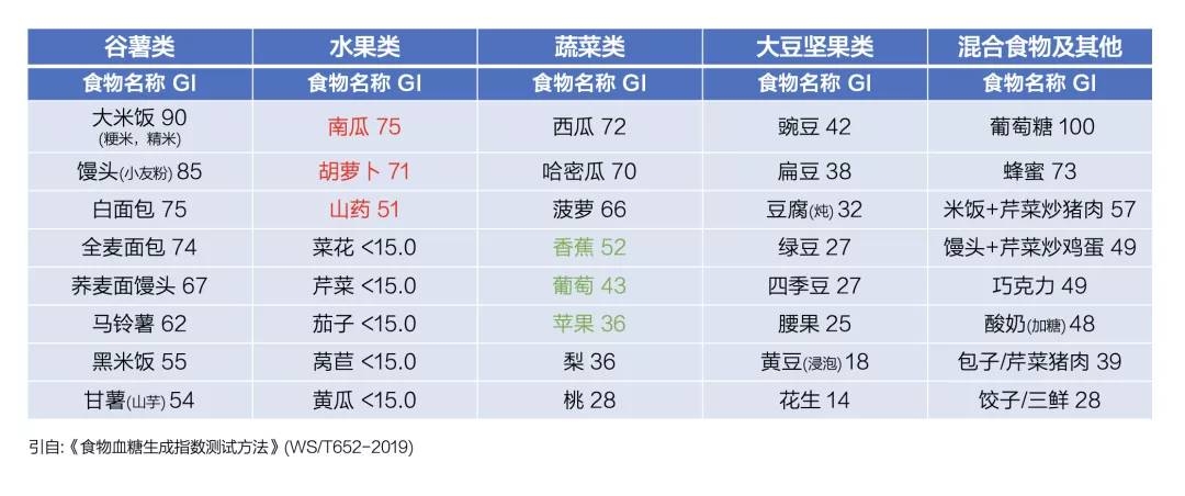 从表格中不难看出,在日常食物中,谷薯类、水果类的GI值偏高;蔬菜类、大豆坚果类的GI值偏低。但是水果类中,香蕉、葡萄、苹果等常见的水果属于低GI食物,而蔬菜中,南瓜、胡萝卜、山药等则属于高GI值食物。