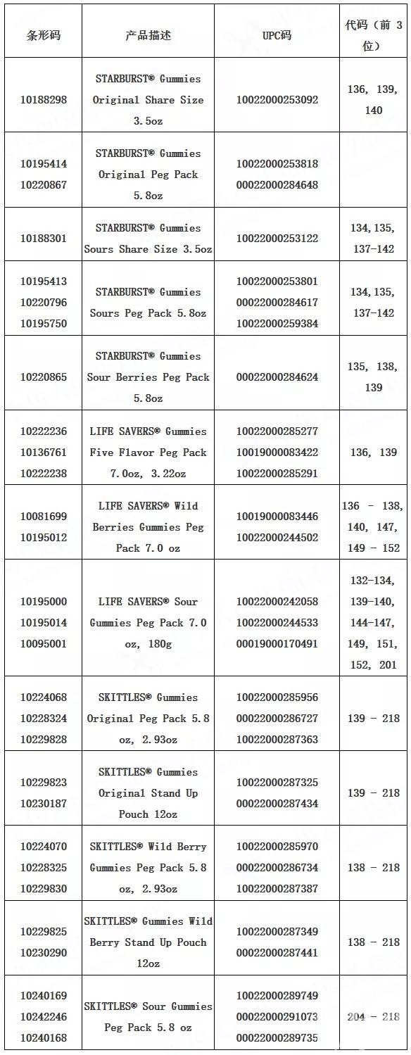 1.暂不通过任何渠道购买玛氏箭牌糖果有限公司正在召回特定批次的SKITTLES软糖、STARBURST软糖和LIFE SAVERS软糖产品(具体产品信息请见附表)。