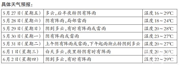 市气象台预计,未来几天我市仍多降水,气温总体较平稳。其中,今天,我市以多云为主,后半夜转阴有阵雨;周六,阴有阵雨,局部雷雨;周日,阴到多云,有时有阵雨或雷雨。别看天气预报只写着阵雨,此轮降雨可不小。市气象台工作人员表示,5月28日至31日白天,受高空槽和低层切变线影响,我市多阵雨天气,其中5月30日前后雨量较大,局部地区有暴雨。提醒广大市民,近期雨水较多,须防范短时强降雨可能造成的城乡积涝、山体滑坡等次生灾害。另外雨天湿滑,能见度较低,请注意交通出行安全。