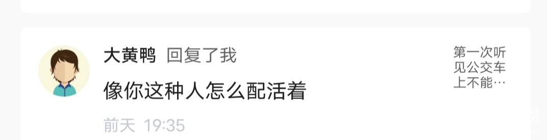 发了一个帖子,只是希望下次公交车不能上婴儿车的,麻烦贴条子什么的,我没有说什么过分的话,你就说我不配活着这位大黄鸭的,网友,麻烦你出来说一下,我怎么不配了,因为我有孩子还是因为我坐公交,现在国家政策都要保护,儿童妇女,怎么到你这里我,因为带孩子出门坐公交车我就不配活着了?还有义乌西门妞,如果有机会我下次坐公交车我带你上去,能不能让你过去,