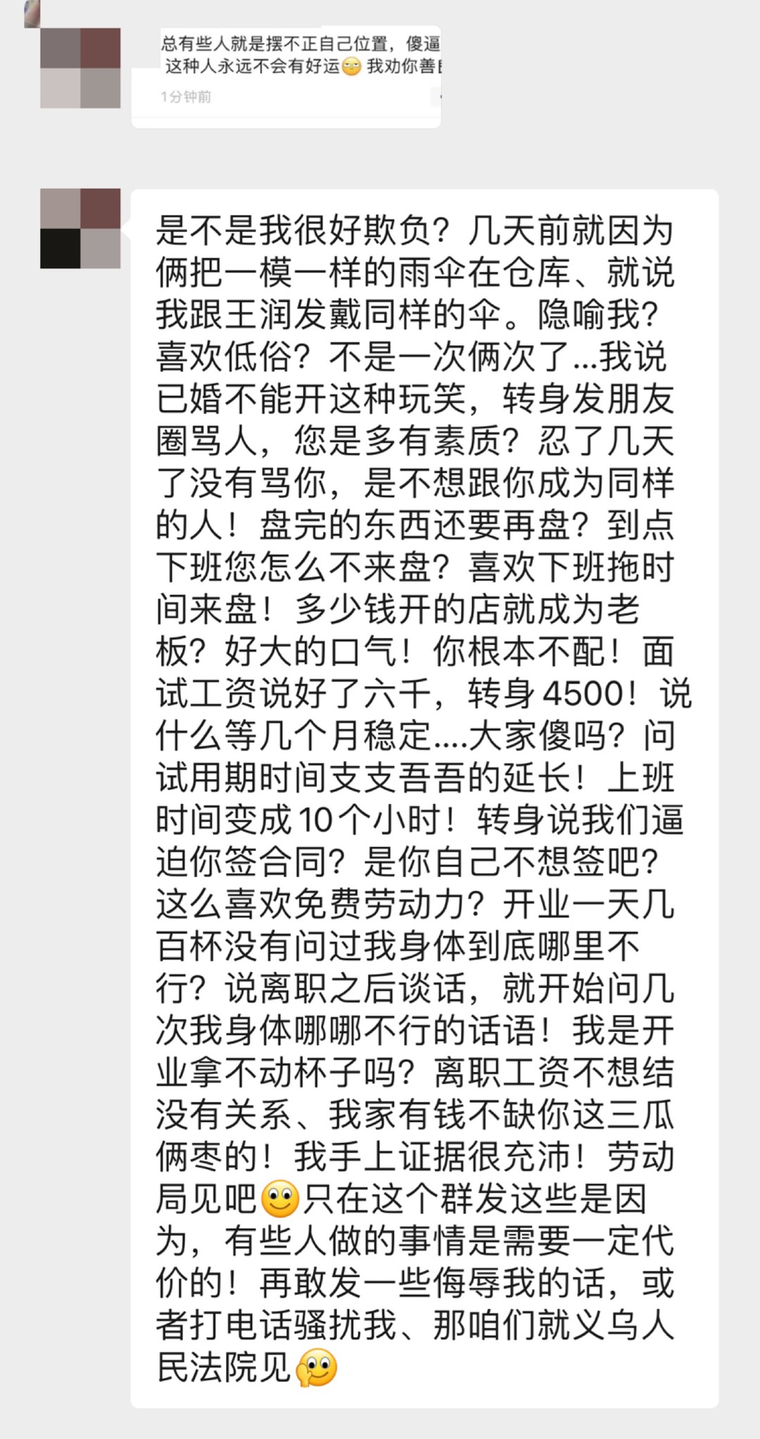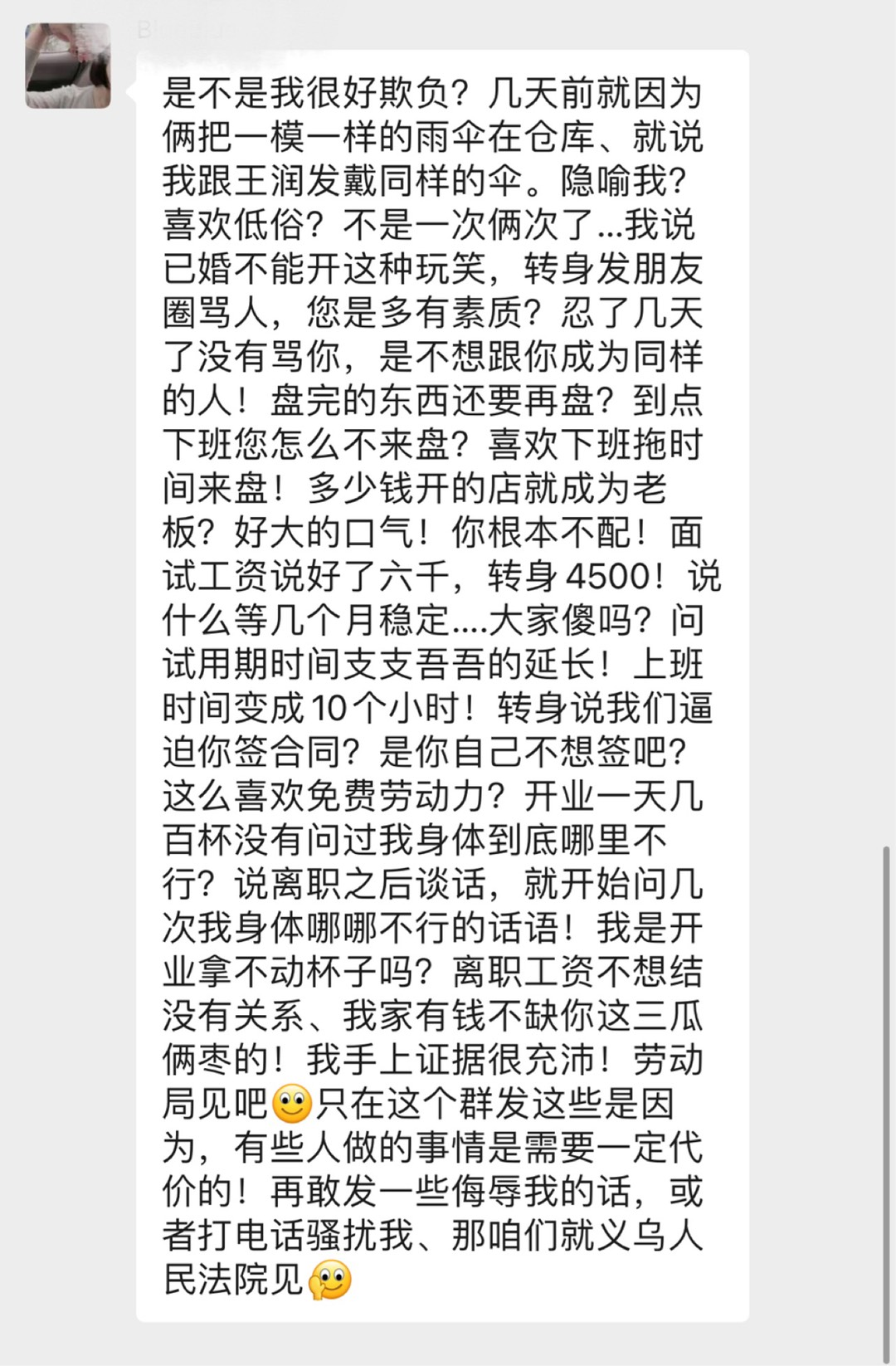 你们说说看,大家来评评理。之前她辞职了之后发到我们工作群一大段话我们没有去理会,并不是因为我们理亏而是我们真的不屑跟你计较,后面不理她还去外面给我们搞事情报复,一直变本加厉所以我看不下去出来解释解释。