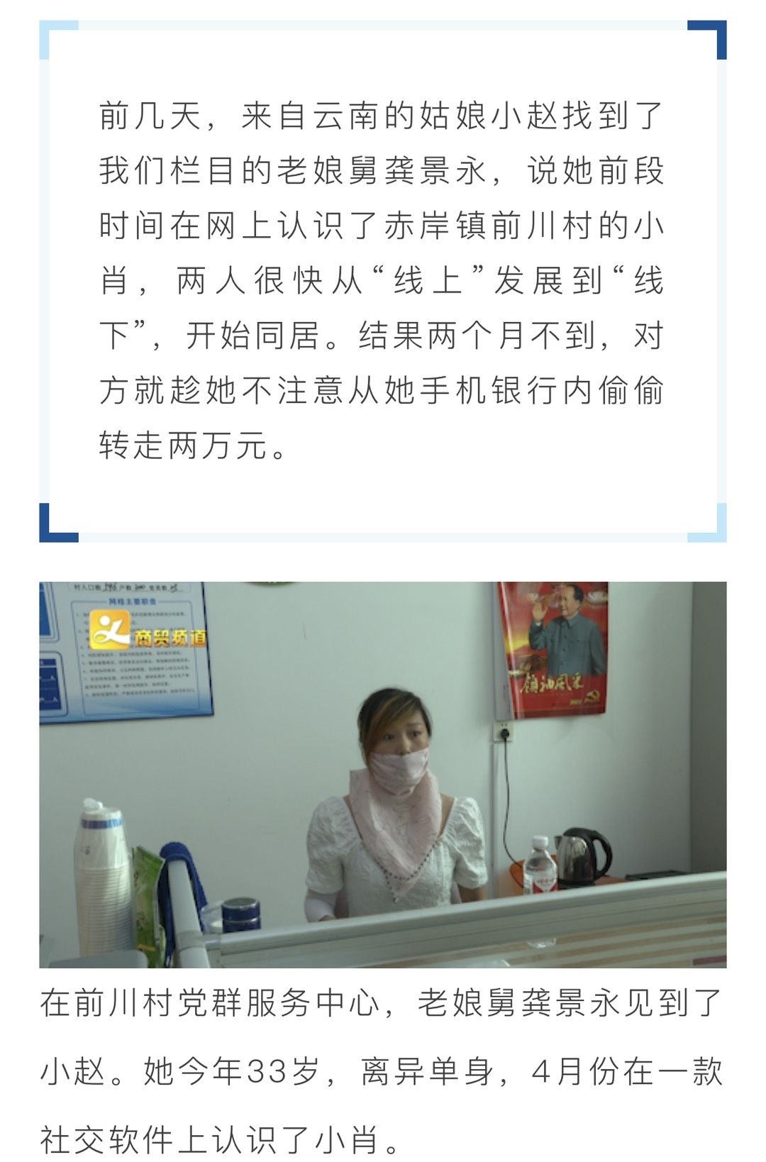 [义乌故事]女子与赤岸一小伙网恋,同居后竟被对方转走两万元!男子家人:你报警了!就不还钱! [复制链接]