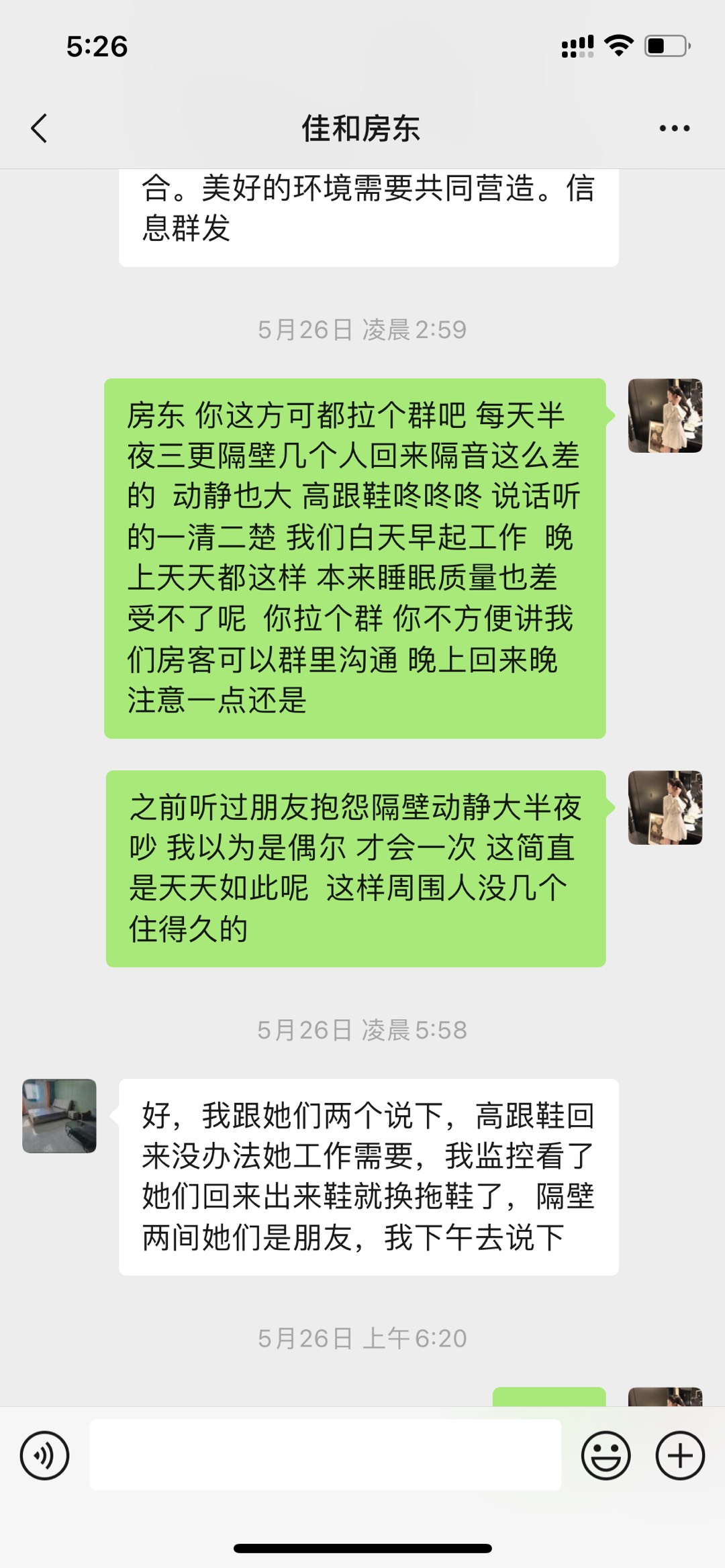 今天半夜吵醒,一直睡不着,眼看天亮要睡着眯一下起来工作,刚有点睡意,又听见几个声音超大的回来,动静那么大,聊些污言秽语,听得一清二楚