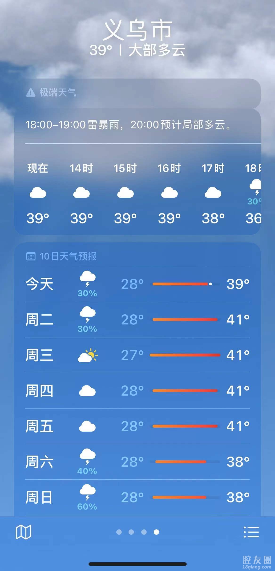 义乌这周天气也太热了吧?出个门都感觉要融化了,周二周三周四周五四天天气已经破40度了。