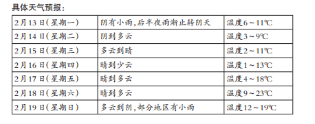 2月以来,阴雨天气“超长待机”,雨水时断时续、时大时小,就算不下雨,也是阴天。什么时候才能见到明媚的阳光?市气象台工作人员表示,强冷空气今天赶到,明天起,晴好天气将上线。值得注意的是,气温也将“大跳水”。据中国天气网消息,2月11日起,一股较强冷空气开始影响我国,西北部地区率先受到影响,甘肃部分地区降温超过10℃。2月13日,冷空气东移南下,中东部大部地区将先后出现4~8℃降温,江南南部、华南北部等地局地降温10℃以上,江南及以北地区将伴有4~5级偏北风,阵风6级左右。市气象台也于2月12日发布强冷空气消息:北方有一股强冷空气正在东移南下,从2月12日后半夜起自北而南影响我市,2月13日我市将有一次明显的降温、降水和风力增大过程,预计日平均气温的过程降温幅度可达8~10℃。2月15日~16日早晨气温较低,平原地区0~2℃,有霜,山区-1~-3℃,有冰冻;过程最大风力5~7级,局部8级。公众请注意关注天气变化,及时添衣保暖,谨防感冒。阳光总在风雨后。本周我市晴多雨少,将有连晴的好天气。从明天起,雨水暂歇,晴好天气上线;2月15日至18日,我市以晴好天气为主;2月19日,我市以多云到阴为主,部分地区有小雨。从气温来看,本周气温起伏较大。昨天最高气温还在21℃,今天最高气温降至11℃,明天最高气温降至9℃。随着晴好天气上线,白天气温上升较快,2月15日—18日,最高气温将一路“狂飙”,升至23℃。值得注意的是,晴好天气也意味着昼夜温差加大。其中2月14日—17日最低气温都在5℃以下,昼夜温差也将逐渐加大,2月17日、18日的昼夜温差达14℃,气温变化幅度大。因此,本周大家要注意气温变化,及时增减衣物。万物之中,希望最美。市气象台工作人员表示,近期的天气总体来看是利于农业生产的,可利用近期的降雨,科学增加库塘蓄水,做好春耕备耕工作,为春季农业生产打好基础。此外,随着天气好转,万物更新、春暖花开,义乌江边、郊外、公园里,处处都预告着春天将到来的消息。此时乍暖还寒,出门踏青、赏花的小伙伴记得还要做好保暖工作。(来源:义乌商报) 请输入描述