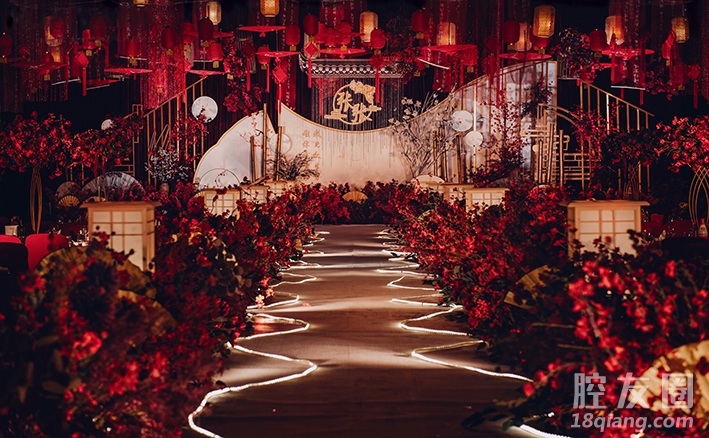 传统中透着现代,现代中揉着古典,加入金色元素,让整个设计变得更加出彩,冲散了浓重的肃穆多了一份轻盈舒缓的的意境,路引采用红叶,以红叶寄相思,表达着新人之间的爱情炽烈而美好。