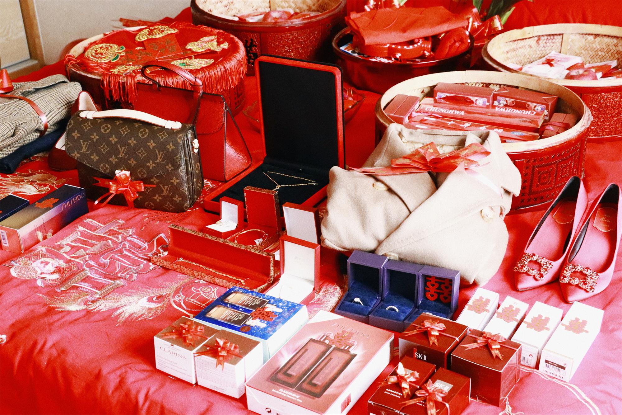 聘礼传统上是:桂圆、荔枝、枣子、莲子、白糖、藕粉、酒、香烟、喜糖、饮料,