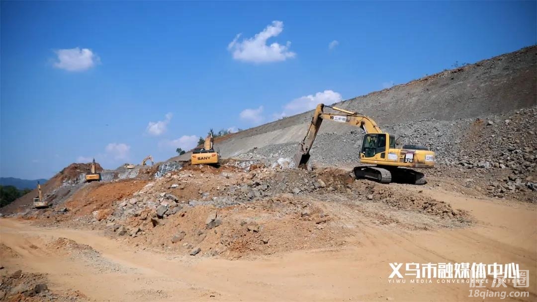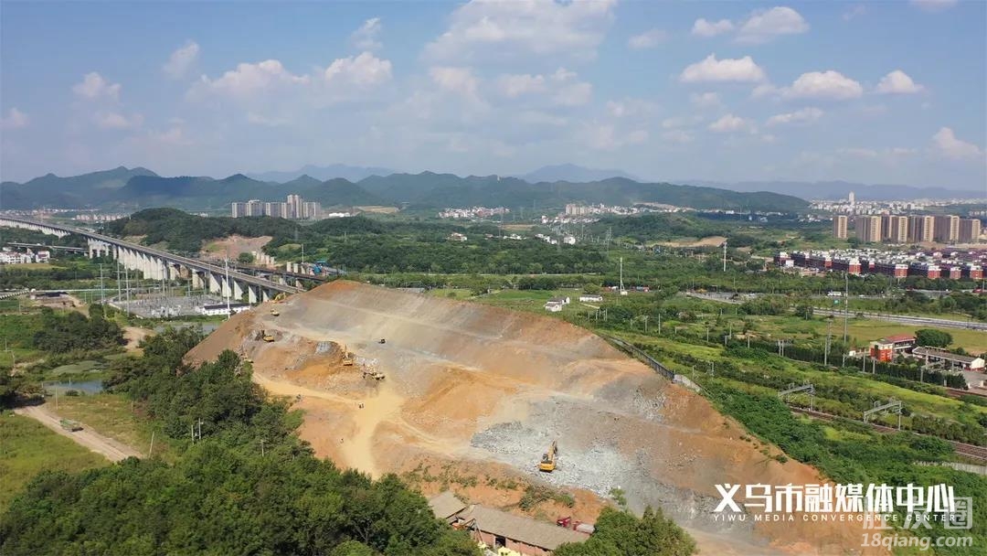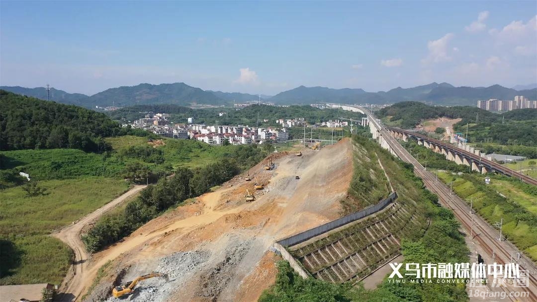 在杭温铁路义乌车站项目施工现场 十余台大型工程机械 正在开挖土石方 同时,边坡防护施工 也在有条不紊地进行