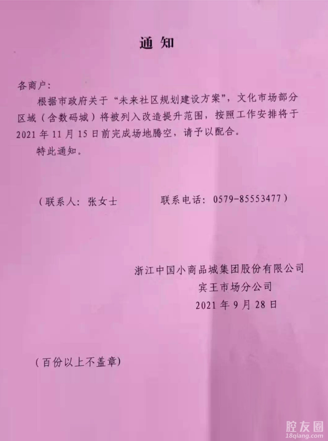 9月28日,浙江中国小商品城集团股份有限公司宾王市场分公司发布通知:根据市政府关于“未来社区规划建设方案”,文化市场部分区域(含数码城)将被列入改造提升范围,按照工作安排将于2021年11月15日前完成场地腾空,请予以配合。