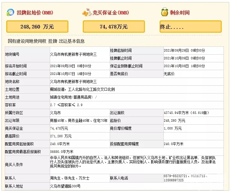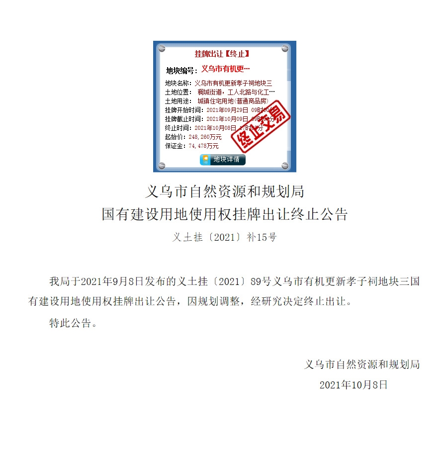 10月8日,义乌市自然资源和规划局发布国有建设用地使用权挂牌出让终止公告。该地块原计划于10月9日挂牌出让。