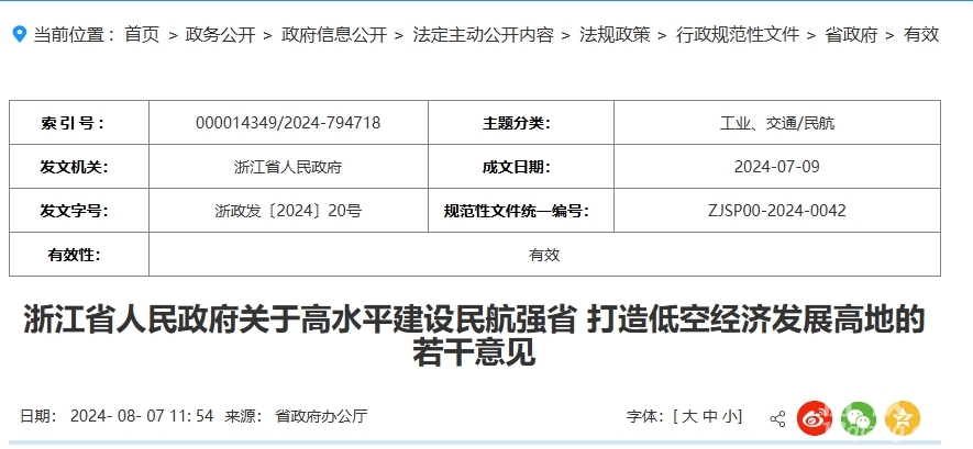 8月7日,《浙江省人民政府关于高水平建设民航强省 打造低空经济发展高地的若干意见》发布。