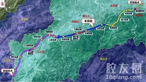 项目起点位于金华市婺城区汤溪镇上镜村东北侧,顺接甬金衢上高速公路金华城区段,终点位于江山市凤林镇贺青村附近与江西省上饶市玉山县交界处。项目主线全长约122.4公里,其中金华婺城段约8.1公里,衢州段约114.3公里,采用双向六车道高速公路标准,计划建设工期4年。